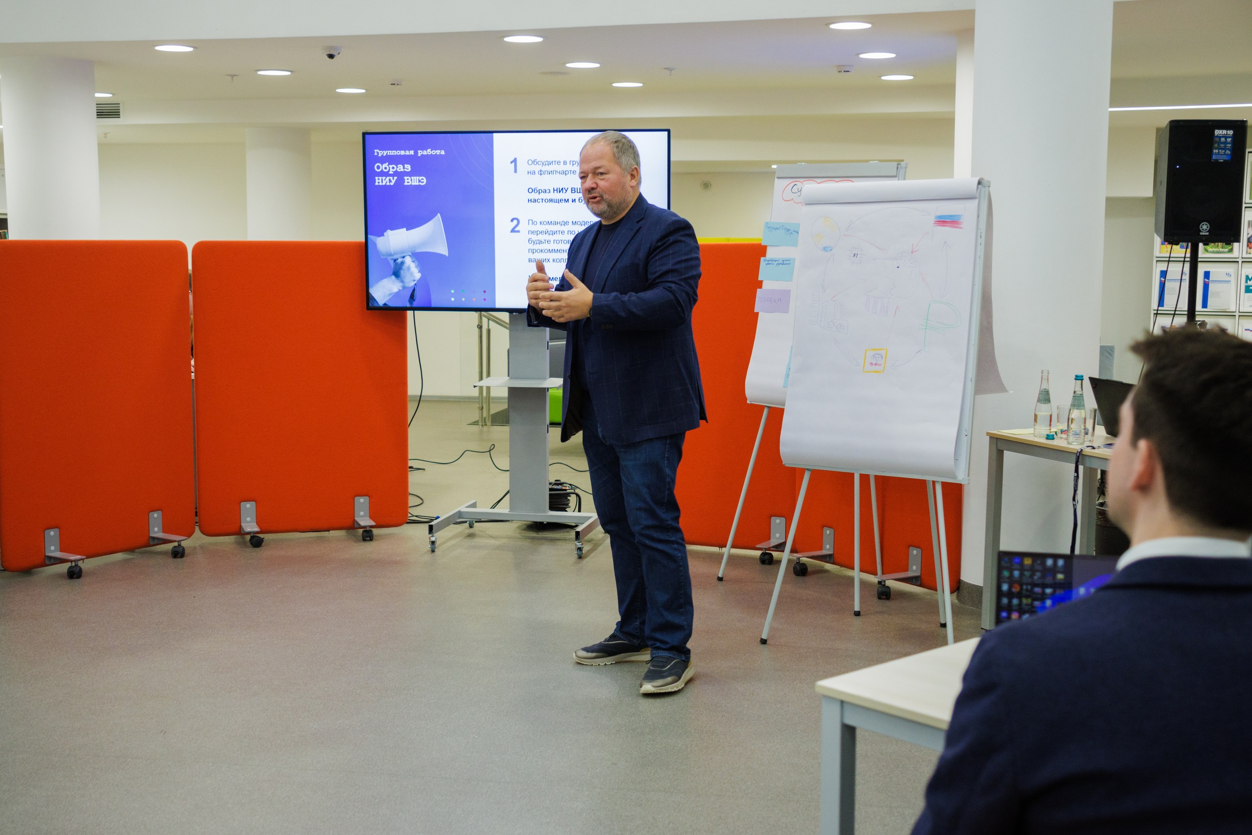 Целью мероприятия стало формирование образа НИУ ВШЭ в 2036 году. Модерировал сессию Владимир Соловьев, руководитель Лаборатории человекоцентричности и лидерских практик НИУ ВШЭ.
